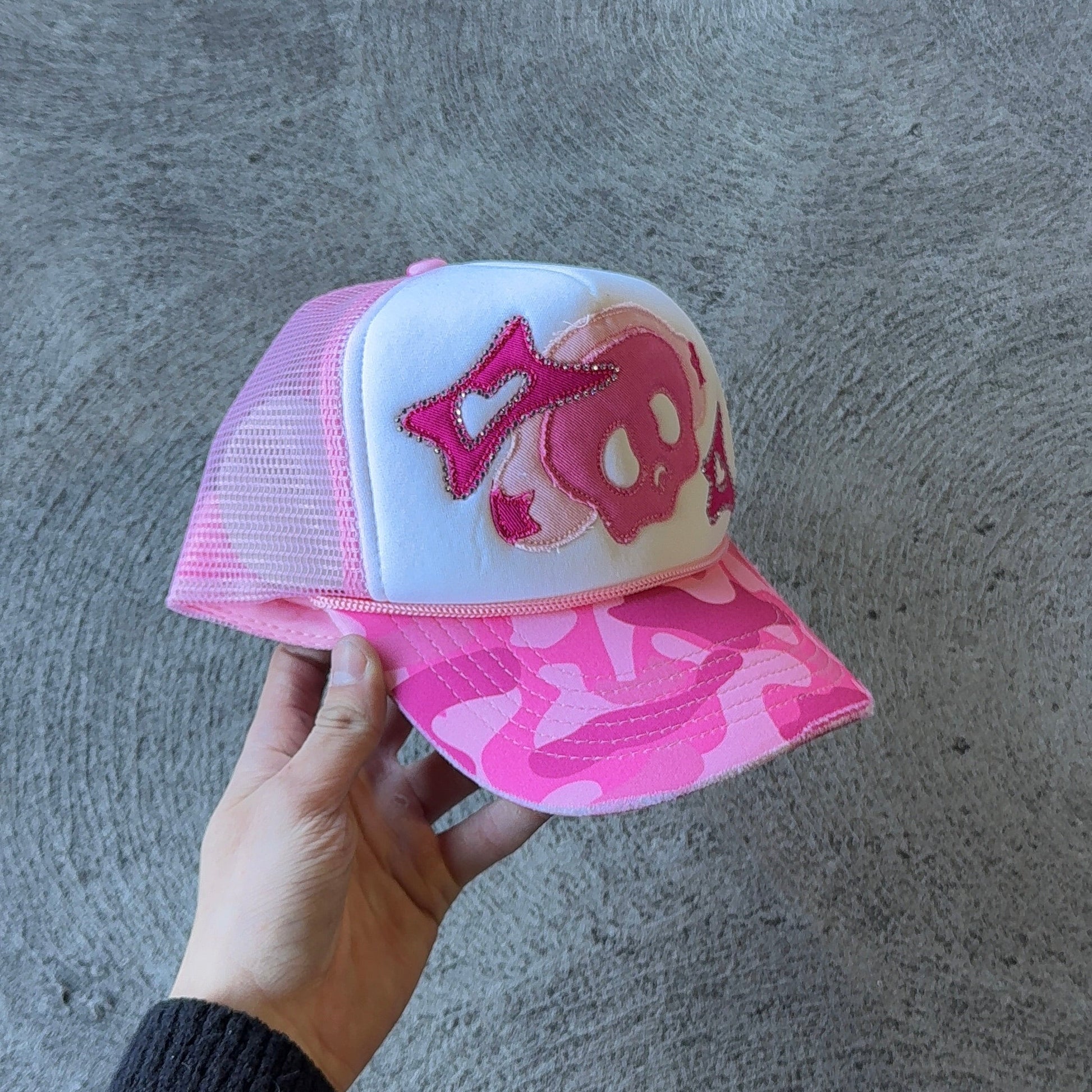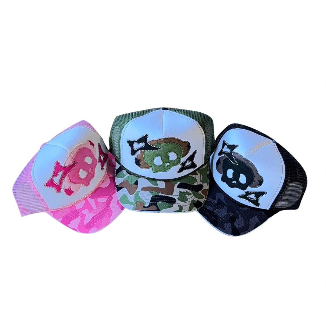 A 4-panel, fully cut-and-sewn trucker built with intention. Designed in army-inspired tones with a custom camo pattern and finished with hand-placed gemstones for a unique standout look.